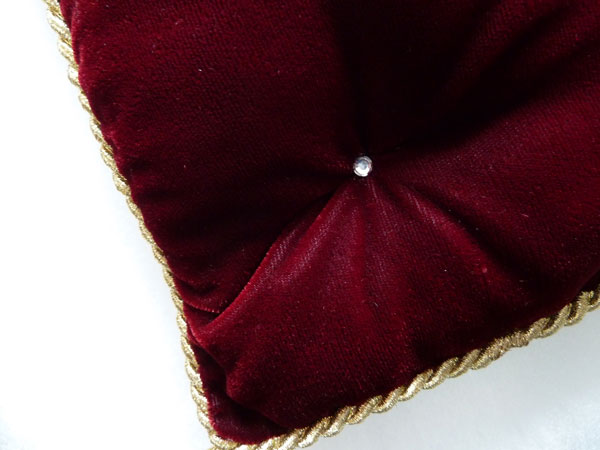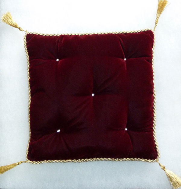 Das Ringkissen habe ich zur Hochzeit meines Sohnes aus dunkelrotem Samt genäht, ringsherum eine goldene Kordel angebracht, sowie goldene Quasten an den Ecken befestigt. Dazu habe ich noch einige Vertiefungen eingenäht, in die jeweils ein glitzernder Kristall eingeklebt wurde.