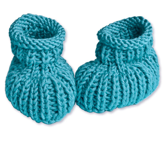 Superweiche Babyschühchen, handgestrickt aus türkisfarbenem Garn mit dezentem Glanz.
