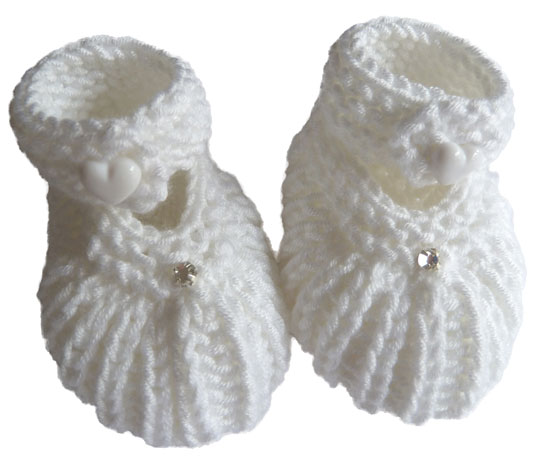 Handgestrickte, superweiche, schneeweiße Babyschuhe mit Riemchen, Herzchenknopf und Knopfloch in sehr dezenter Glanzoptik.