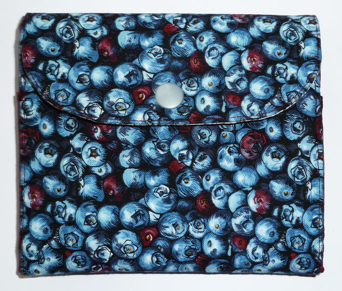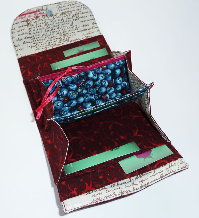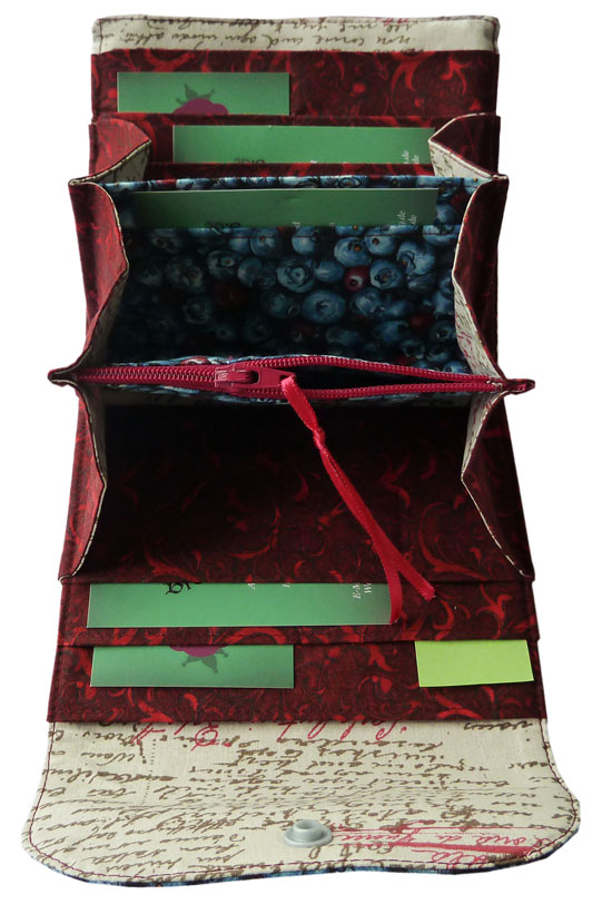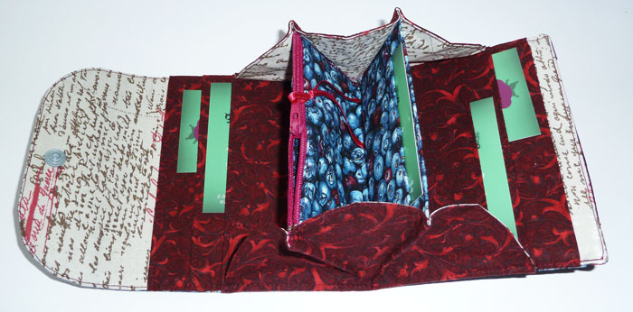 Ich habe einen Geldbeutel mit sehr vielen Kartenfächern genäht. Verschlossen wird er mit einem Druckknopf. Das Kleingeldfach hat einen Reißverschluss.