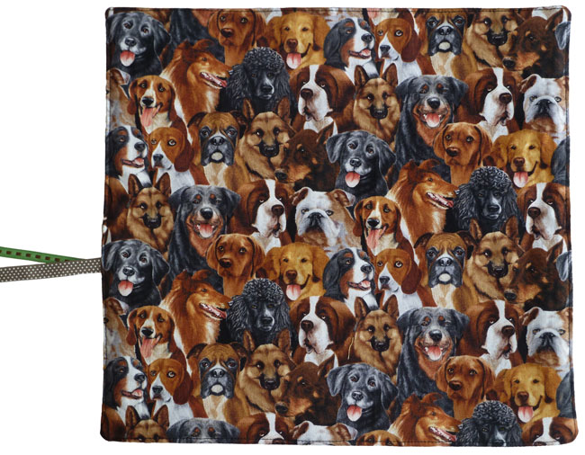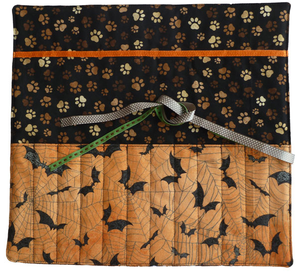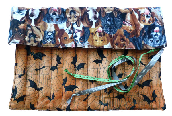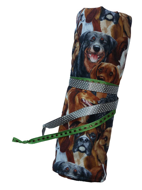 Die Stifterolle mit Hundemotiven auf der Außenseite und Fledermäusen im Innern für die Stifte, ist passend für 12 Stifte. Durch die obere Lasche, die heruntergeklappt wird, kann kein Stift herausfallen.