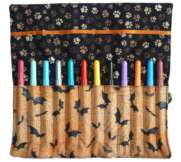 Wenn die Stifte in die Fächer gesteckt sind, wird einfach aufgerollt und mit dem angenähten Band zugebunden.