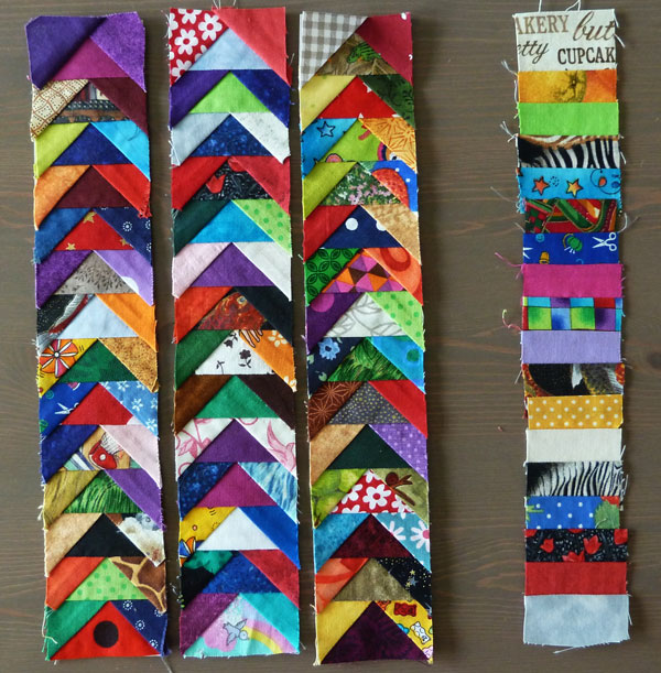 Die Abschnitte sammle ich in Schachteln und Gläsern, und wenn alles überquillt von Stoffstückchen, nähe ich aus den Miniteilen solche Bänder, die sich irgendwann in ein Projekt als Randstreifen wunderbar einarbeiten lassen. Ein Beispiel ist mein Wandquilt „Kinder der Welt“, in dem ich solche Streifen verwendet habe.