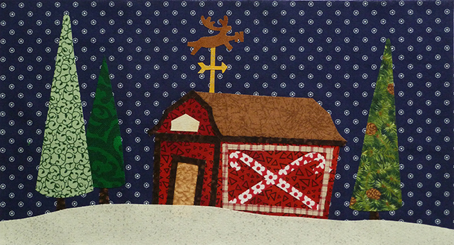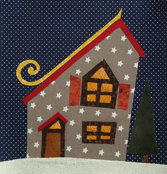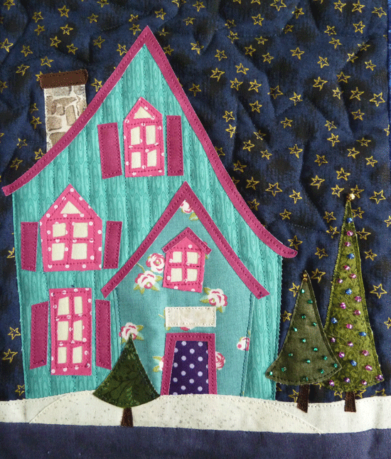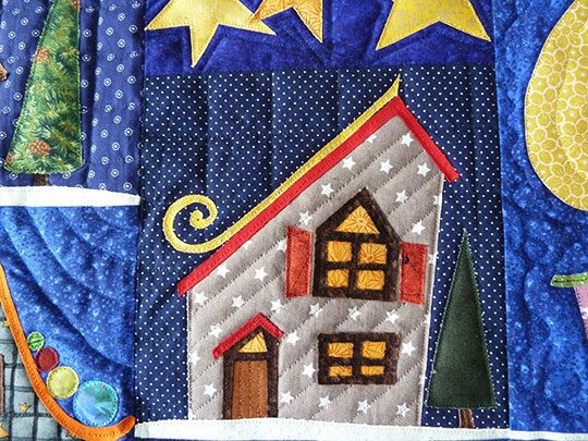 Die Häuser und sonstigen Motive wurden appliziert, und verschiedenartig gequiltet. Auf die Randstreifen habe ich Sterne gequiltet, und zum Schluss den Quilt mit allerlei Perlen, Borten, Glitzerkram und Knöpfen verziert. Aus den Tannen wurden Christbäume, die Sterne blinken, und die Haustüren haben Griffe.
