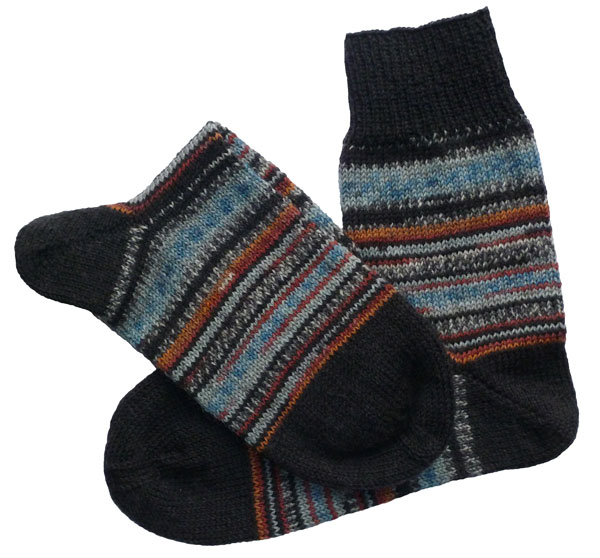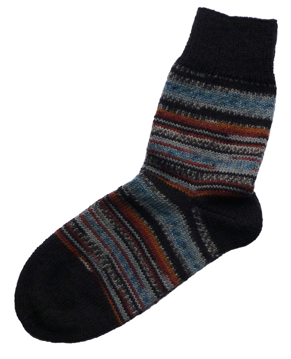 Diese Herrensocken habe ich in Größe 44 aus Regia Pairfect fall night color, 4-fädig, mit Nadelstärke 4 von Hand gestrickt.