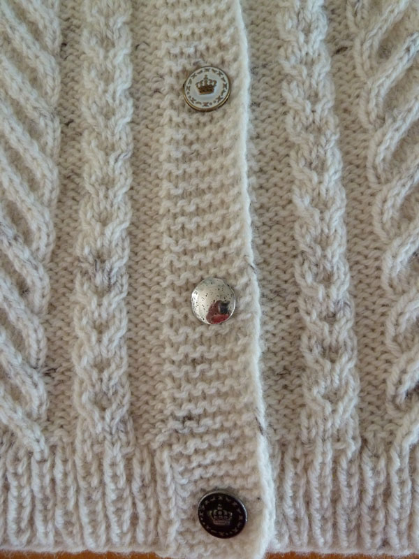 Die Jacke wird mit Metallknöpfen geschlossen, wobei jeder Knopf ein anderes Design hat.