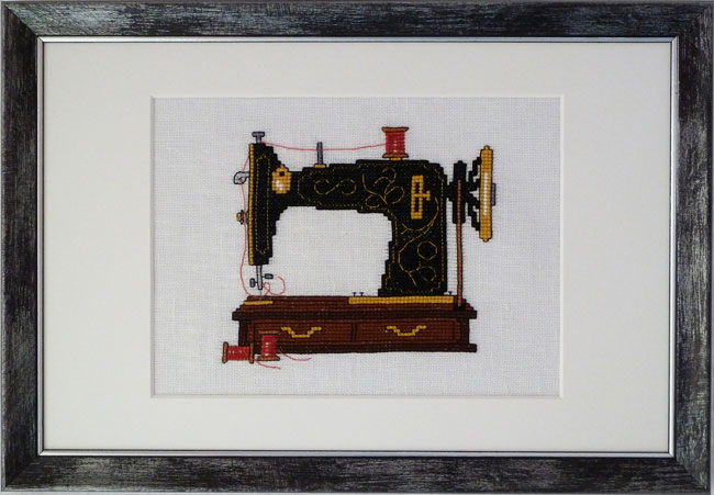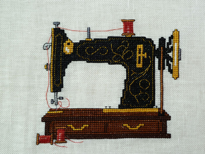 Die alte Nähmaschine habe ich auf feinem Baumwollstoff mit zweifädigem Sticktwist nach Zählmuster gestickt.Das Motiv hat eine Größe von 11 x 13 Zentimetern.