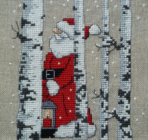 Die glitzernde Schleife an der Laterne wurde mit einfädigem rotem Metallicgarn gestickt.