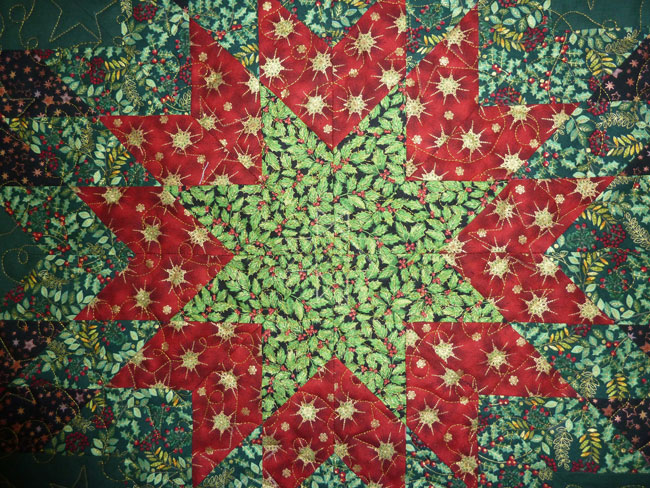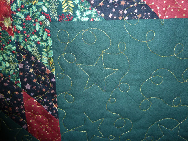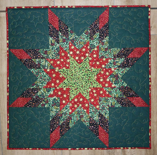 Genäht habe ich den kleinen Quilt aus verschiedenen weihnachtlichen Baumwollstoffen. Die Rückseite ist rot mit filigranen goldenen Schneeflocken.