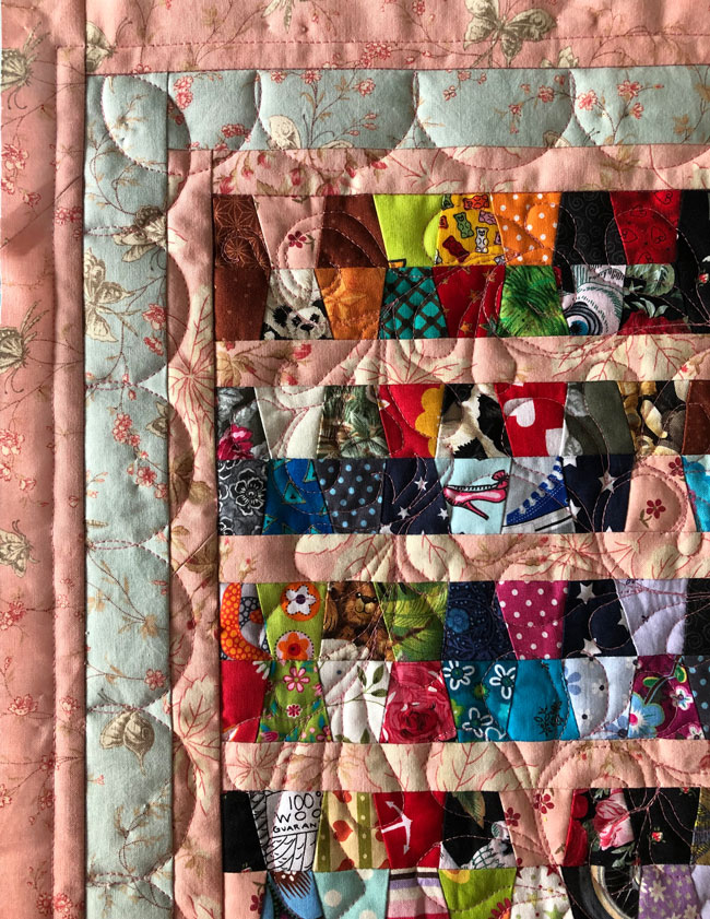 Gequiltet habe ich bei diesem Projekt zum ersten Mal auf meiner neuen Longarmmaschine. Free motion ohne Vorzeichnung in der Mitte, Rulerquilting an der Umrandung.