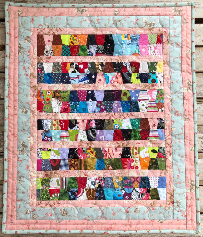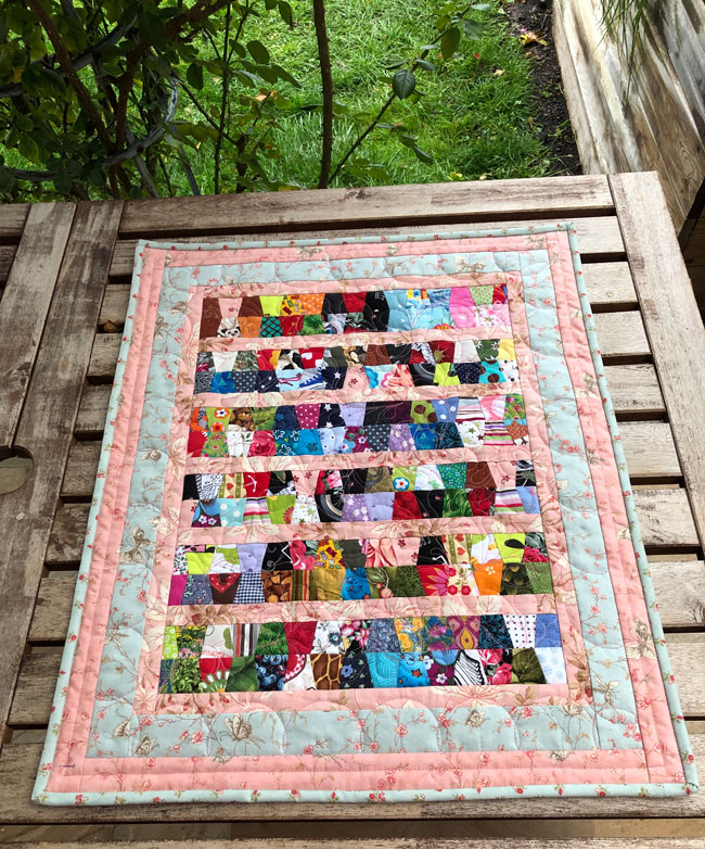 Die bunte Mitte habe ich aus kleinen Stoffresten zusammengesetzt. Die Umrandung besteht aus etwas größeren Resten.