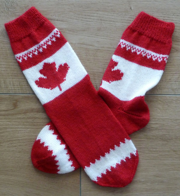 Die Musterstreifen habe ich eingestrickt, das Ahornblatt nachträglich im Maschenstich aufgestickt.