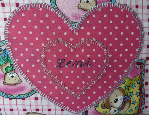 Auf die Vorderseite habe ich ein Herz appliziert und mit Silberfaden aufgestickt, sowie mit der Nähmaschine den Namen der Puppenmami eingestickt.